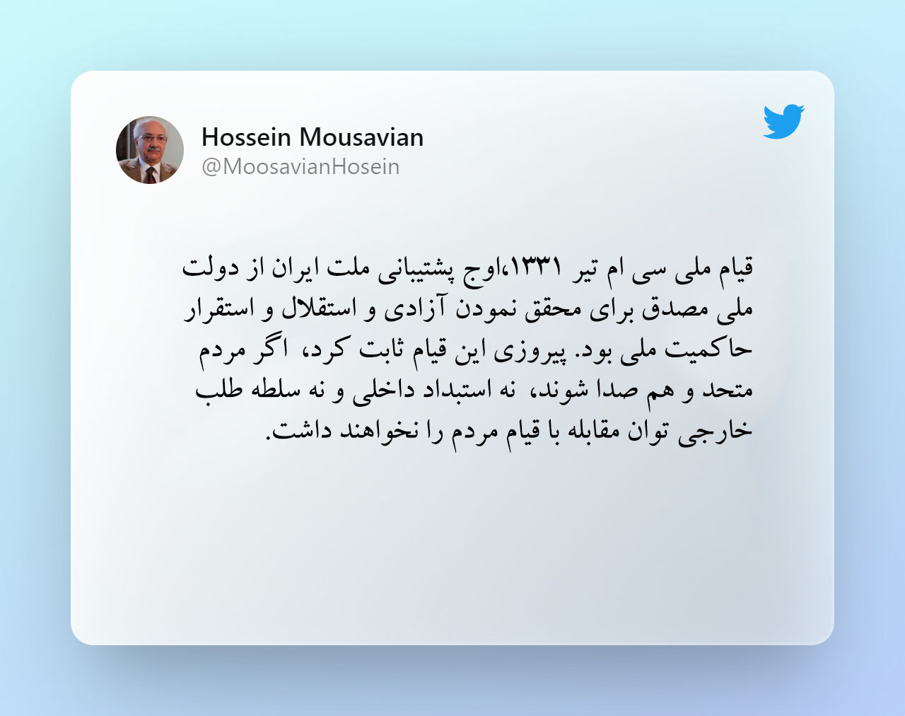 این نوشته تنها ذکرخلاصه و فشرده ای فهرست وار از زندگی سیاسی من است ونباید به عنوان یک بیوگرافی و یا یک خاطرات سیاسی تلقی گردد. من حسین موسویان متولد هفدهم اسفند ۱۳۲۰ در تهران هستم. در سال ۱۳۳۰ ده ساله و در کلاس چهارم دبستان بودم که دولت ملی دکتر محمد مصدق شروع به کار کرد. در آن هنگام جنبش ملی کردن صنعت نفت و جوّ استقلال طلبی و آزادی خواهی، آن چنان جامعه ایران را فراگرفته بود که کودکان دبستانی را هم نسبت به مسائلی که در جامعه می گذشت مجذوب و علاقه مند کرده بود... ادامه در بخش زندگینامه